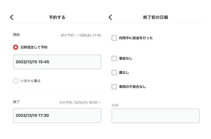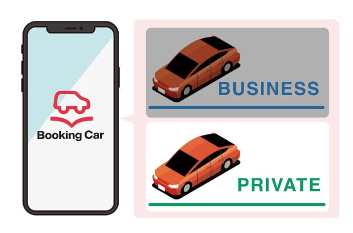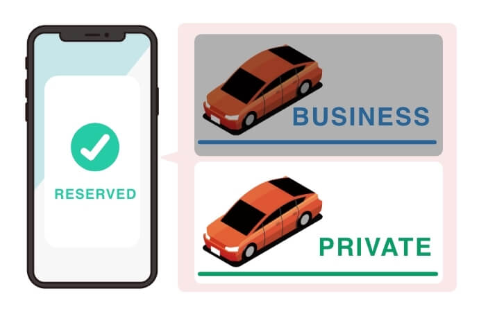 利用目的をプライベートに切り替えるだけで簡単に予約が可能です。休日の利用や直帰からそのままプライベート利用にスムーズにご利用可能です。