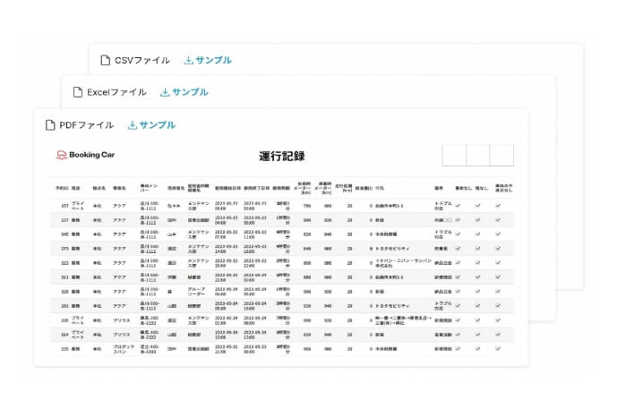 各種データはPDF・Excel形式でダウンロード可能。そのまま運行記録や管理に利用できます。車両や従業員情報の一括アップロードにも対応。