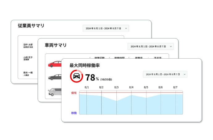 運行情報をもとにデータをシンプルなグラフで表示。車両や従業員、拠点ごとの利用傾向を可視化します。