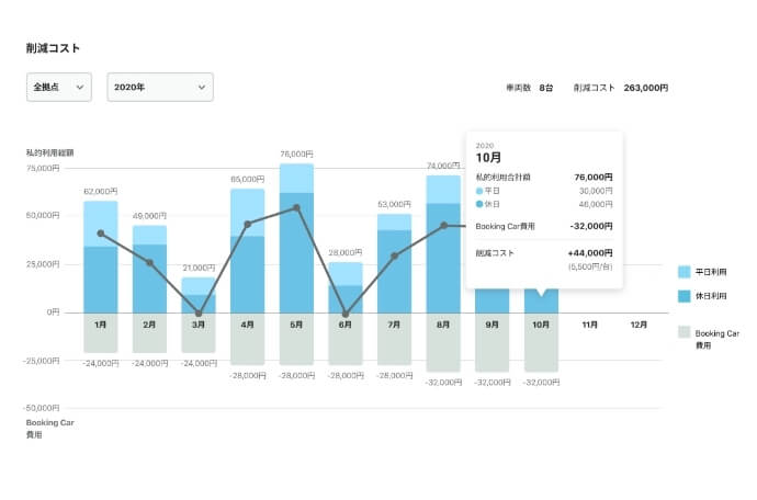 ダッシュボード上で、車両ごとの利用実績額や月々のコスト削減効果などの利用状況が一目でご確認いただけます。